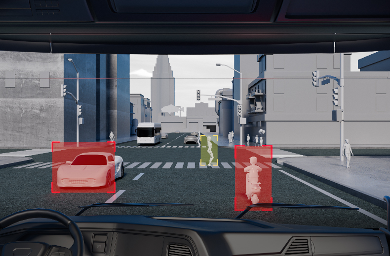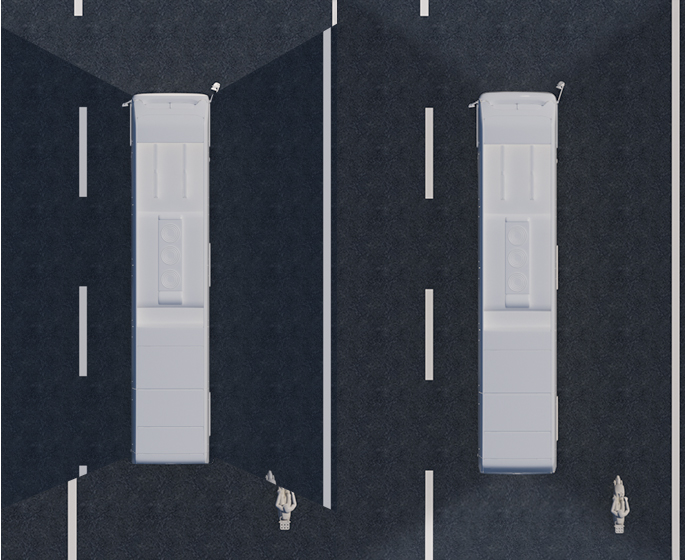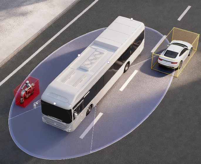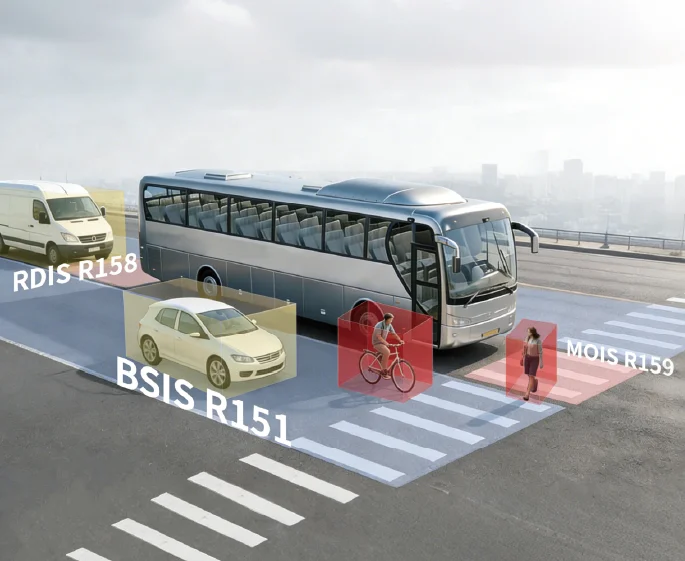 MOIS is a moving-off safety system specially designed for commercial vehicles such as buses and trucks. When the vehicle is stationary or moving off at low speed, the front camera monitors vulnerable road users in the blind zone. If a collision risk is detected, the system issues visual and audible warnings to the driver in compliance with UN ECE R159 requirements.